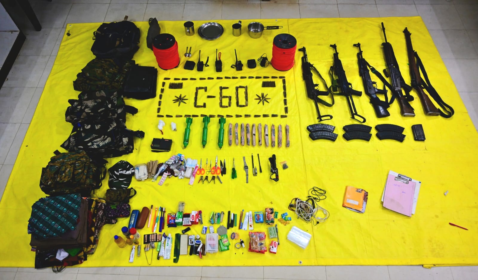 अभियान स्थल से सुरक्षा बलों ने तीन एके-47, एक एसएलआर, एक .303 रायफल, 173 जिंदा कारतूस, बीजीएल, मैगजीन, कॉर्टेक्स वायर, जिलेटिन स्टिक तथा अन्य नक्सली साहित्य बरामद किया है। यह बरामदगी माओवादी संगठन की सैन्य क्षमता को बड़ा झटका मानी जा रही है।